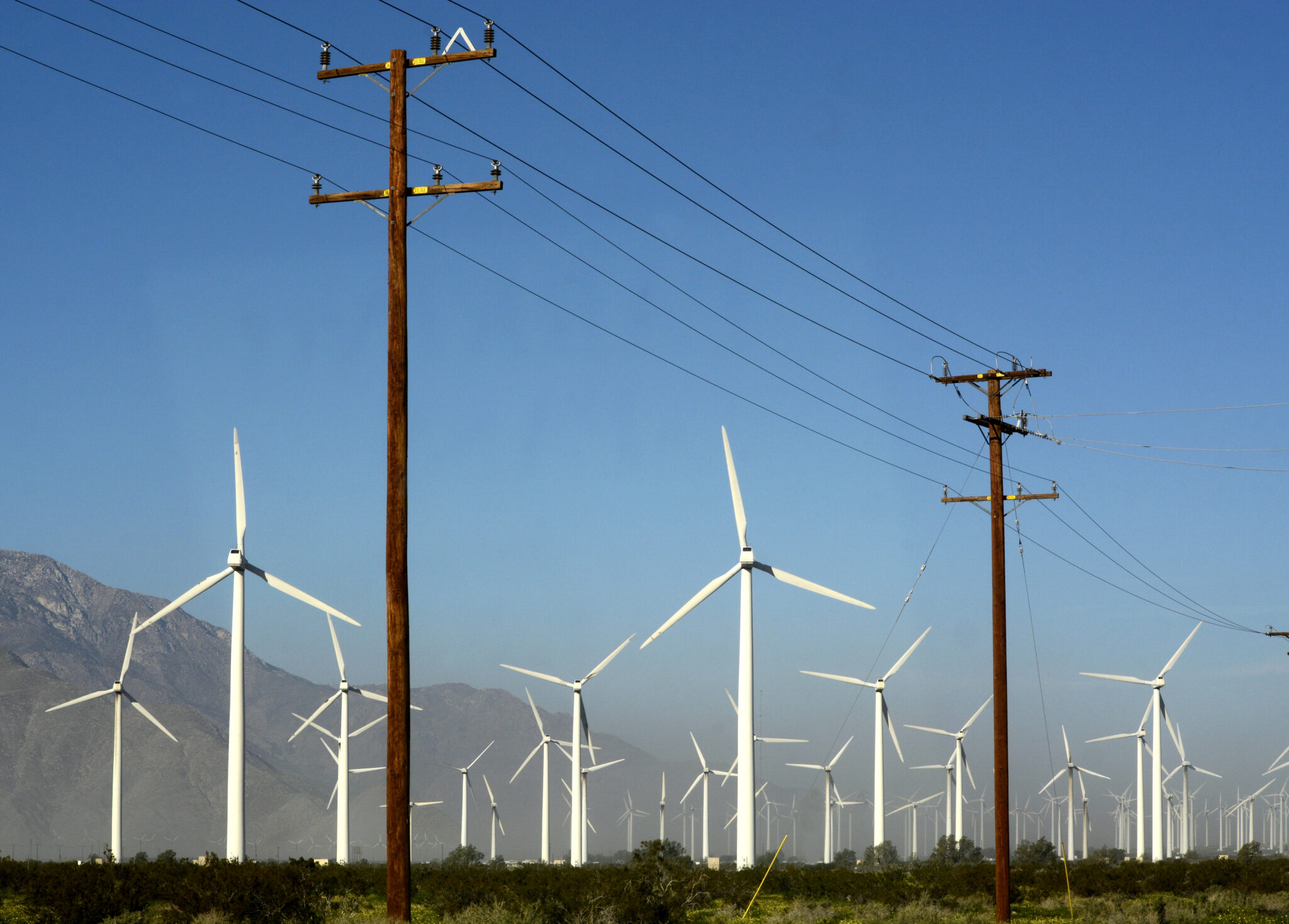 PALM SPRINGS, CALIFORNIA - FEBRUARY 27, 2019: Wind turbines located near power poles and transmission lines generate electricity at the San Gorgonio Pass Wind F…