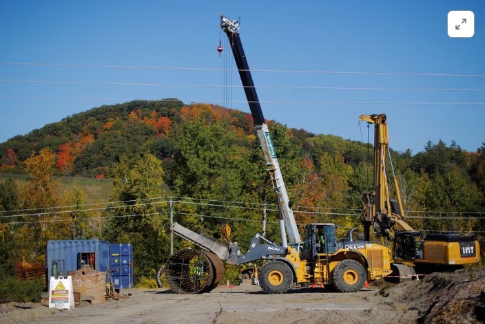Workers install the footing for a new pole for transmission lines for the New England Clean Energy Connect project (also known as the Clean Energy Corridor), wh…