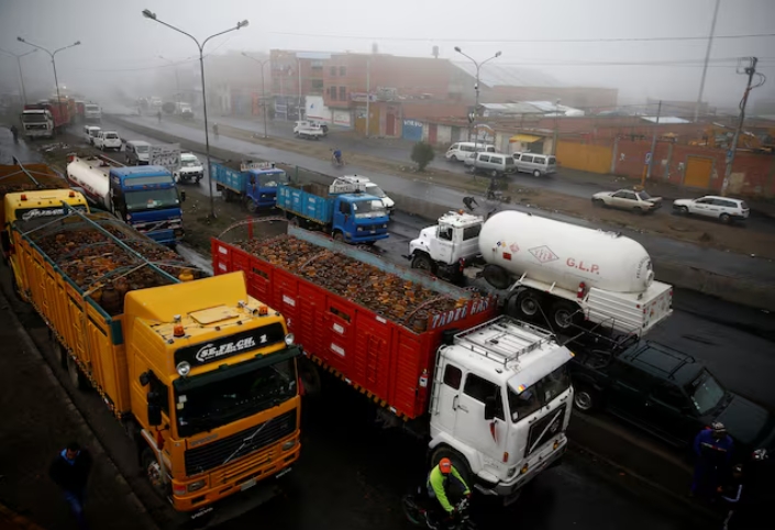 Trucks with gas cylinders and a gasoline tank truck are seen next petrol plant of Senkata outskirts of La Paz, Bolivia, November 23, 2019. REUTERS/David Mercado…