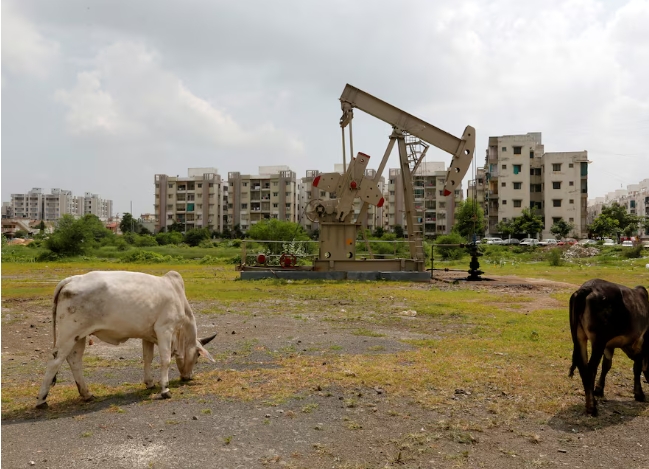 Cows graze next to an Oil and Natural Gas Corp's (ONGC) well in an oil field on the outskirts of Ahmedabad, India, September 8, 2016. Picture taken Septembe…