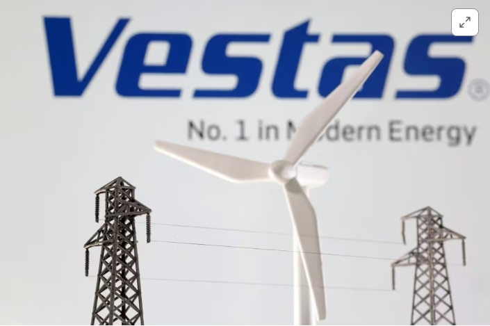 Miniatures of windmill and electric pole are seen in front of Vestas logo in this illustration taken January 17, 2023. REUTERS/Dado Ruvic/Illustration/File Phot…