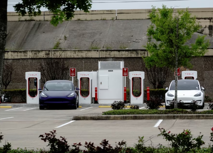Tesla electric vehicles (EVs) fast-charge using Tesla Superchargers at a Buc-ee’s travel center and gas station in Baytown, Texas, U.S., March 18, 2023. R…
