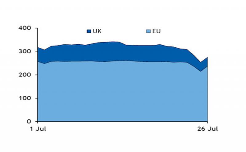 UK gas flows to the EU could stay minimal in August-September, as almost all surplus gas could be added to mid-range storage.