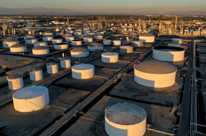 Storage tanks are seen at Marathon Petroleum's Los Angeles Refinery, which processes domestic & imported crude oil into California Air Resources Board (CARB…