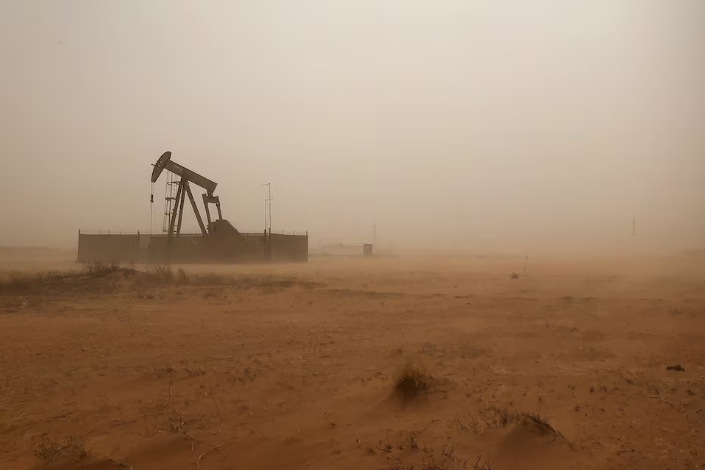 A pump jack lifts oil out of a well during a sandstorm in Midland, Texas, U.S., April 13, 2018. Picture taken April 13, 2018. REUTERS/Ann Saphir/File Photo Purc…