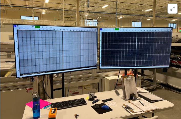Panels are given the final electroluminescence and AI visual inspections at Heliene's solar panel factory in Iron Mountain, Minnesota, U.S. in this undated …