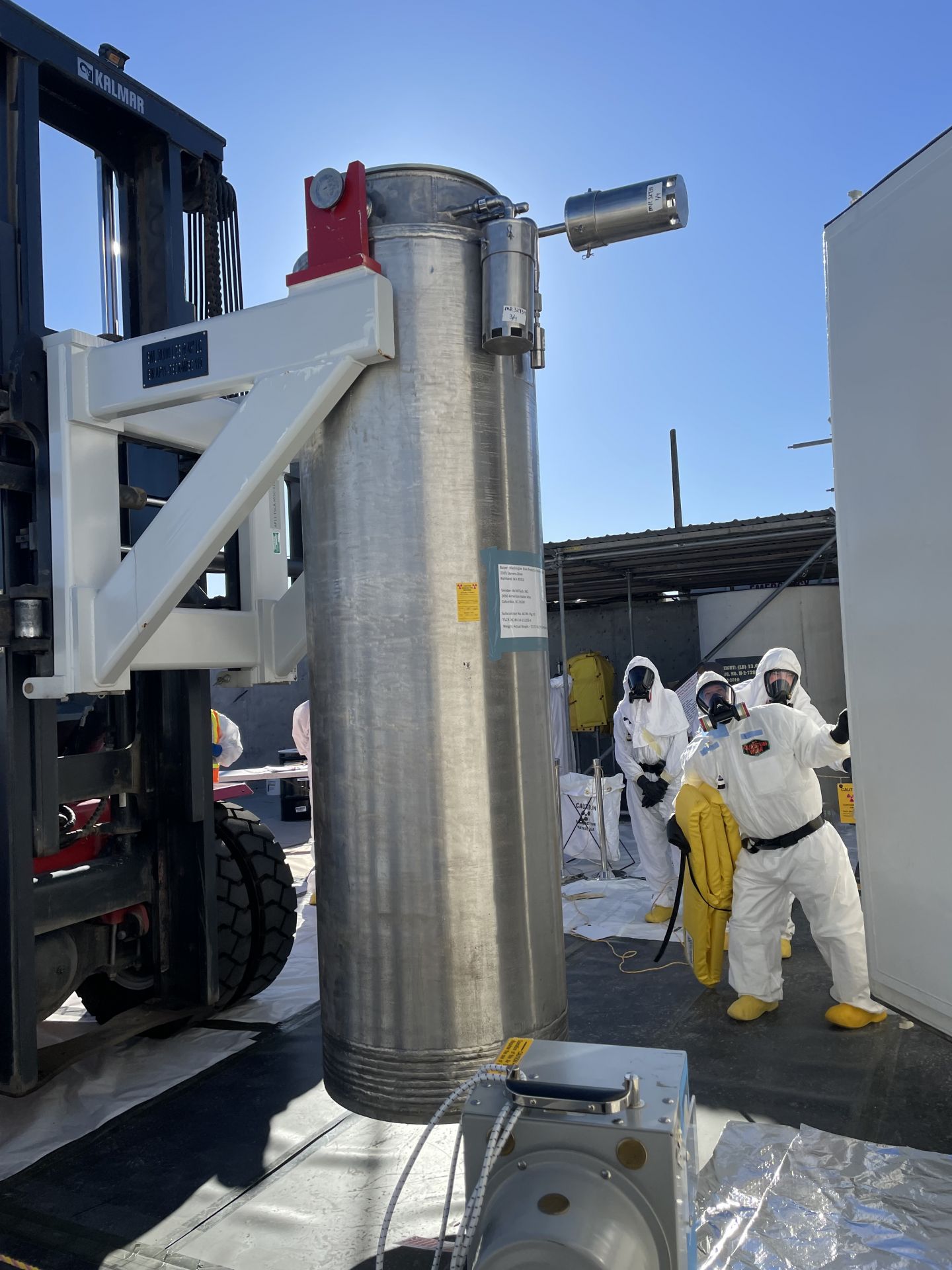 Workers change out spent 27,000-pound TSCR filter columns and place them on a nearby storage pad during a planned outage. (Photo: DOE)Following a second planned…