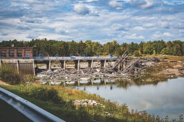 Sanford Dam in Michigan, US, several months after failing in 2020. Research has indicated an increased risk of similar events due to more intense rainfall under