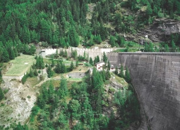 Beauregard Dam, a gravity arc contruction, before the partial demolition which reduced the dam from 72 meters height to 20 meters height – Valgrisenche Vi