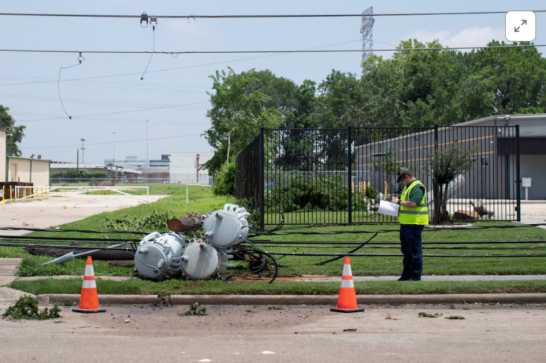 A CenterPoint Energy inspector takes note of a downed transformer while residents remained without power after a severe storm caused widespread damage in Housto