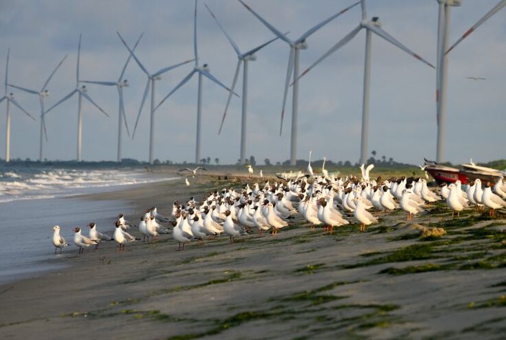 A flock of migratory brown-headed gulls (Chroicocephalus brunnicephalus) in Mannar with windmills in background.In a dramatic turn of events, Indian tycoon Gaut