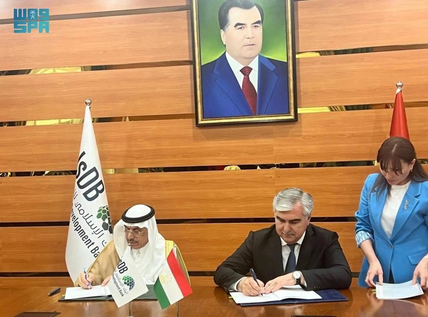 Islamic Development Bank (IsDB) Group President Dr. Mohammad Al-Jasser and Tajik Minister of Finance Fayzuddin Qahrizoda sign the agreement on Monday. (SPA)