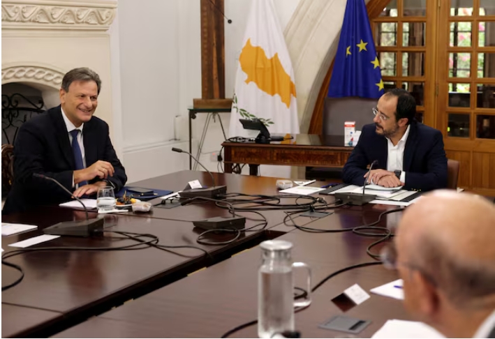 Cyprus President Nikos Christodoulides and Greek Energy Minister Theodoros Skylakakis talk during a meeting with representatives of Greece and Cyprus to discuss