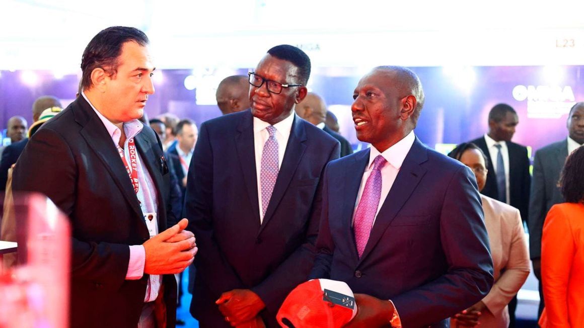 An exhibitor having a conversation (L) with Energy Secretary David Chirchir (C) and President William Ruto during Africa Energy Forum held at KICC in Nairobi, K