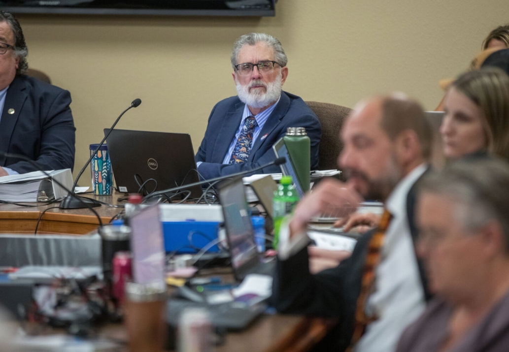 Lynn Helms, center, director of the Department of Mineral Resources, listens Tuesday, June 11, 2024, during a public hearing in Bismarck on proposed carbon diox