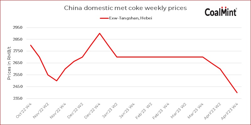 China's met coke prices in Hebei's Tangshan were assessed at RMB 2,400/t ($348/t) on 24 Apr'23. Prices fell by RMB 100/t ($15/t) w-o-w. This is the